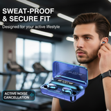 La pantalla LED muestra la carga exacta de cada auricular y del estuche, así que no hay sorpresas. Con el estuche de carga de 2000 mAh, que ofrece hasta 90 horas de reproducción total, puedes estudiar, trabajar y relajarte sin tener que buscar un enchufe.